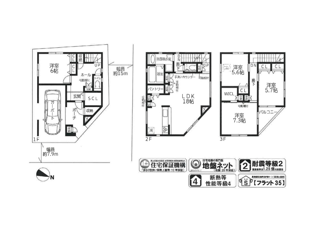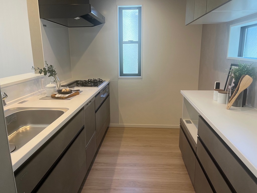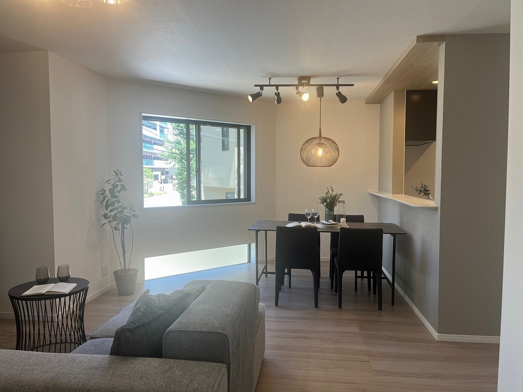 JR摩耶駅南出口を西へ約160m、徒歩2分ほどのアクセスとなります。阪神西灘駅にも徒歩3分ほどの近さです。北側15m、東側8mの北東角地に面した木造3階建新築分譲住宅、1区画の販売です。グレーの外観がお洒落な雰囲気で、ビルトインの駐車場が1台分付いております。延べ床面積129u(車庫面積含む)に、4LDKの間取りが配置されております。本物件の一番の特徴は、収納の多さです。外部の車庫横に2箇所、玄関横シューズクローク、キッチン背面に大容量の食器棚、また横には5か所に収納庫が設置されているのです。トイレは1階と2階、バルコニーは3階の1か所のみです。周辺道路は広いのですが、それほど交通量は多くなく、JR車両通過音も気になるほどではございません。室内設置の小物や家具は、ディスプレイ用にて、撤去されます。