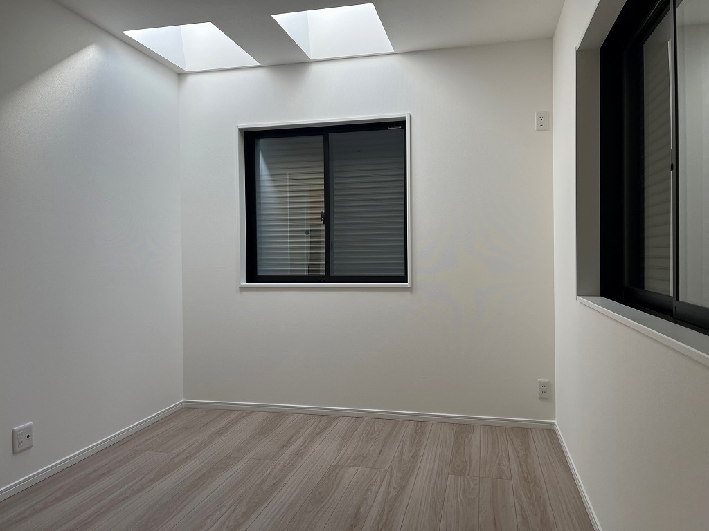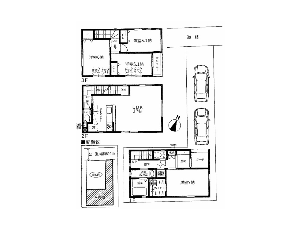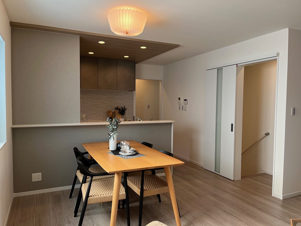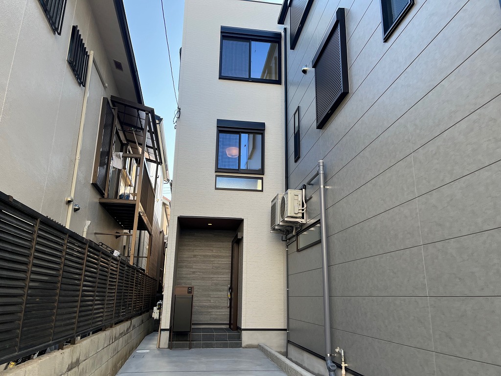 阪神魚崎駅を東南へ約250m、徒歩3分ほどのアクセスとなります。阪神電車と国道43号線の中間付近の立地、周辺は駅前ですが、もっぱら木造住宅が建ち並ぶ住宅街となっております。本物件は、北側3.8m幅員の道路に、間口が2.6m面した旗竿形状地で、新築分譲住宅2区画販売の、奥の建物となります。通路箇所に駐車スペースがございますが、車両サイズの制限がございます。延べ床面積99uに、4LDKの間取りを配置、トイレは1・2階の2箇所にございます。キッチン背面には、大容量の食器棚が設置されております。3階洋室の一部に、天井にトップライトがあり、採光の確保がなされております。国道43号線の車両通行音は、それほど気にはなりません。室内設置の小物や家具は、ディスプレイ用にて、撤去されます。